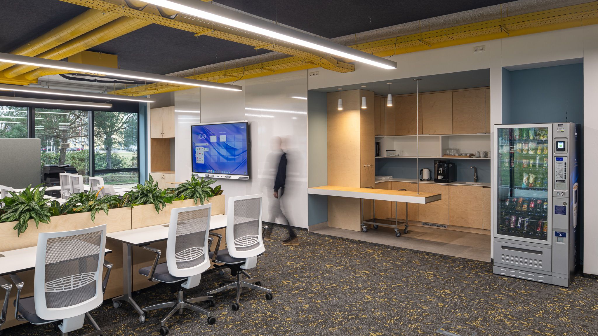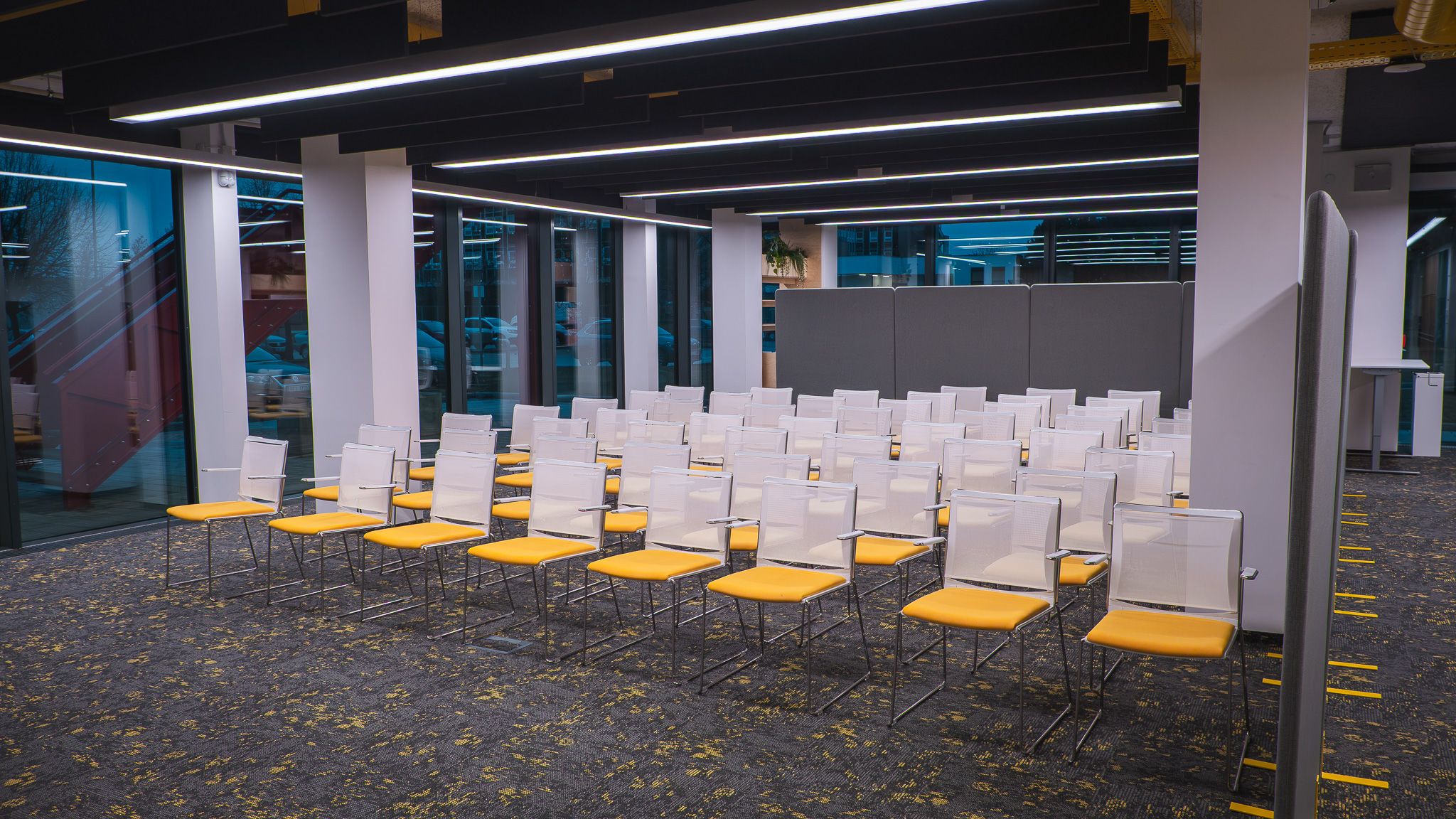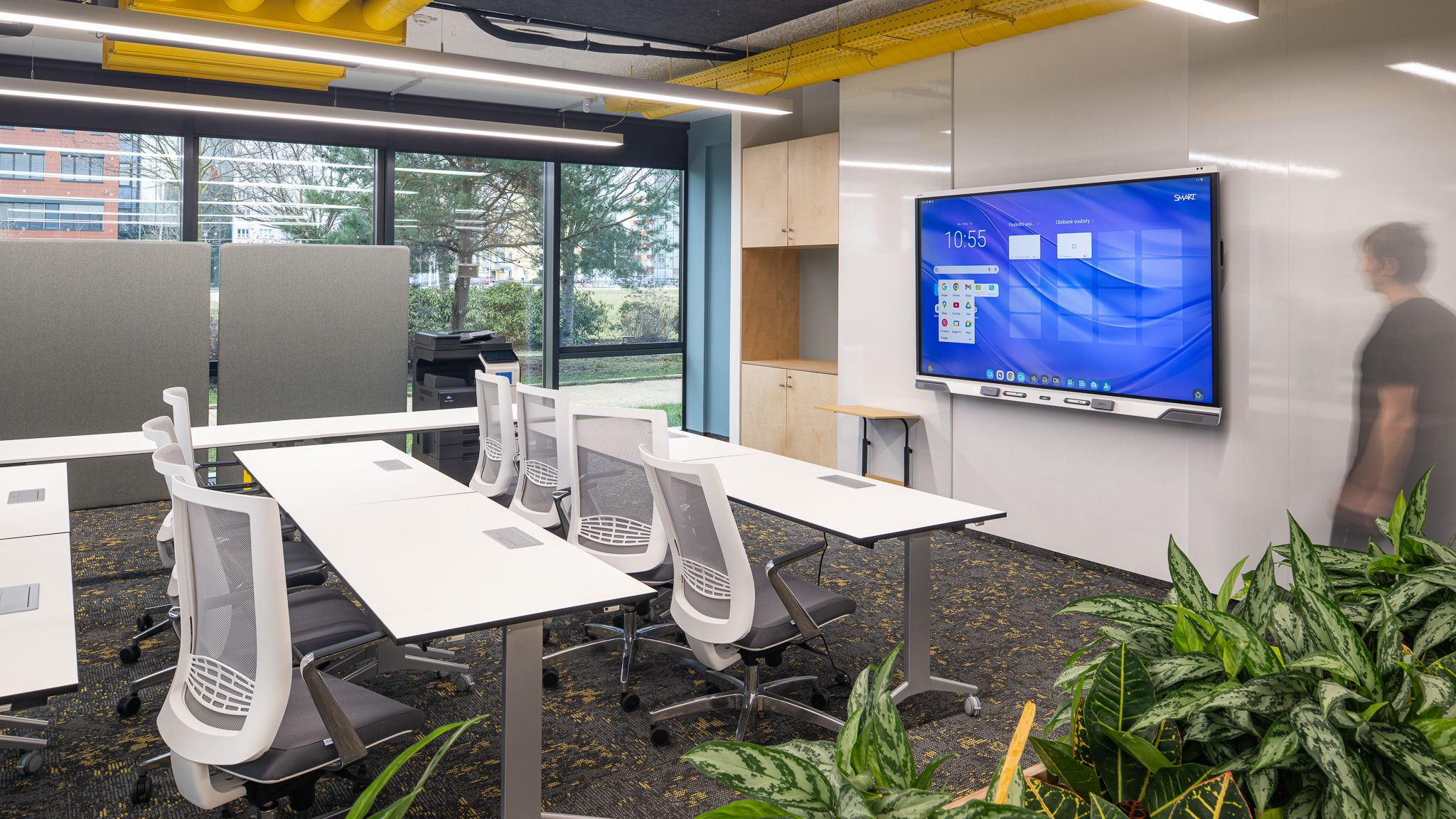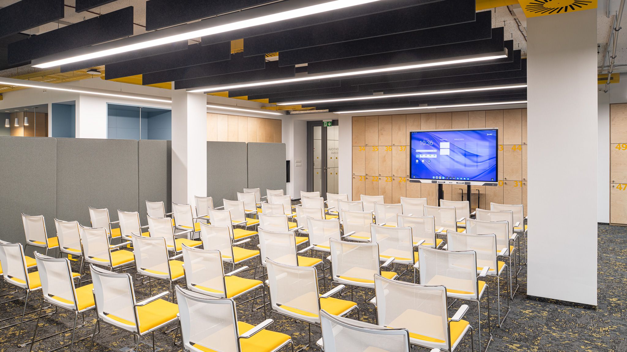 Projektová učebna / coworking – moderní prostor pro podnikatelské záměry a networking s variabilním uspořádáním a zázemím včetně šatních skříněk, kuchyňkou, myčkou, kopírkou, interaktivními LCD displeji, wi-fi, flipcharty.