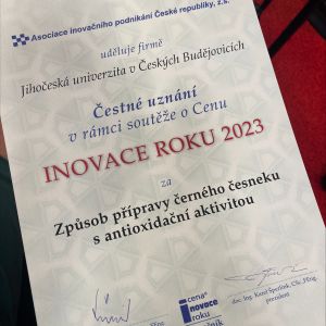 V letošním roce se ucházelo o toto prestižní ocenění celkem 312 inovativních technologií. Do této soutěže se nám za Kancelář transferu technologií v letošním roce podařilo přihlásit technologii z Fakulty zemědělské a technologické a sice: „Způsob přípravy černého česneku s antioxidační aktivitou a černý česnek připravený tímto způsobem“. Naše technologie byla vyhodnocena jako TOP 10 v rámci CENA INOVACE ROKU 2023, což je mimořádný úspěch. Za kolektiv původců technologie na slavnostním večeru představil a ocenění převzal dr. Jan Bedrníček spolu s vedoucí kanceláře transferu technologií.