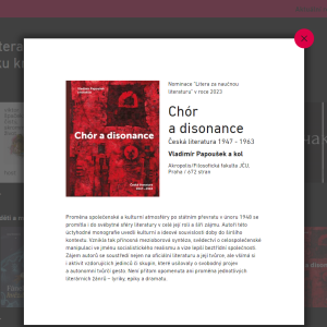 Autorský tým, který tvoří literární a umělečtí historici a teoretici z filozofických fakult Jihočeské a Karlovy univerzity v čele s profesorem Vladimírem Papouškem, se těší z nominace knihy Chór a disonance na cenu Magnesia Litera 2023. Slavností vyhlášení vítězů proběhne 17. dubna 2023 (ČT art). Kolektivní monografie Chór a disonance vyšla na konci roku 2022 pod nakladatelstvím Akropolis (Filip Tomáš) ve spolupráci s Centrem pro výzkum novější české literatury a literární teorie Filozofické fakulty JU. O grafickou úpravu se postaralo studio Stará škola. Kniha byla slavnostně pokřtěna na FF JU dne 22. 2. 2023, dále byla kniha představena 30. 3. 2023 na FF UK. Autorskému týmu srdečně gratulujeme!