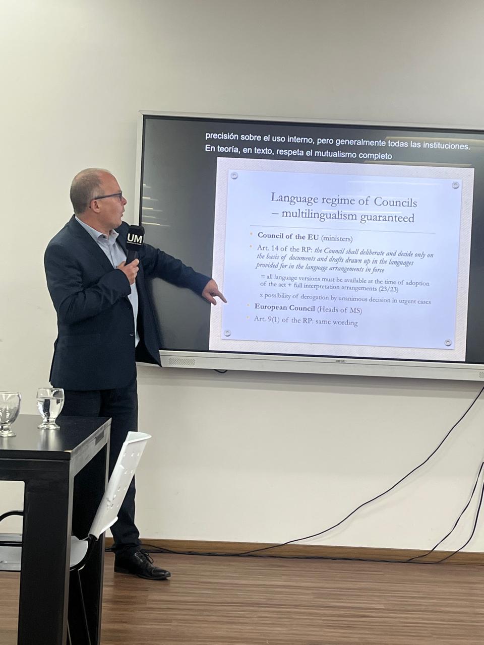 Dr. Petrů dále vystoupil s přednáškou o institucionálním systému a jazykovém režimu Evropské unie, kterou místní studenti pozorně vyslechli, neboť evropské právo není v Argentině součástí výuky právnických fakult. Přednášku navštívil mj. student Francisco Forti, který loni absolvoval na FF JU svůj zahraniční studijní pobyt, během něhož měl také možnost zapojit se do práce na projektu LegTerm.