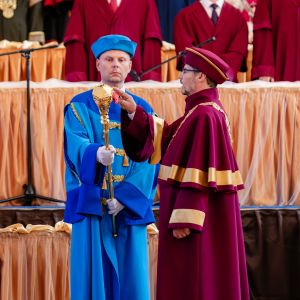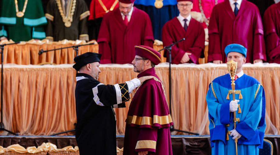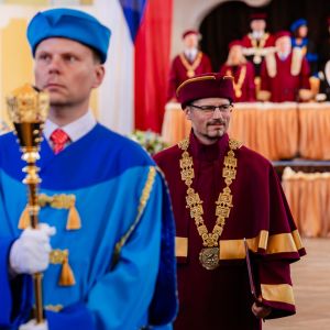 Poté již následoval slavnostní akt inaugurace, při kterém rektor JU profesor Pavel Kozák převzal z rukou předsedy Akademického senátu JU insignie univerzity, složil akademický slib a přednesl svůj slavnostní projev. V něm nový rektor například zmínil vědeckou kvalitu JU a její zvyšování, které považuje za jednu z priorit svého funkčního období. „Jihočeská univerzita patří mezi špičkové vědecké instituce a výzkum v oblasti ochrany životního prostředí, biologie, rybářství, vodního hospodářství a dalších disciplín kvalitně pokrývá i díky svým výzkumným infrastrukturám od Vodňan, přes Papuu Novou Guineu až po polární centrum na Svalbardu. Tento výzkum má nejen lokální, ale i globální dopad a přináší inovativní řešení pro současné i budoucí generace. Bez kvalitní vědy nemůže být kvalitní výuka. Náš výzkum není možný bez úzké spolupráce s dalšími vědeckými institucemi. Zmínit chci spolupráci s Akademií věd ČR, jež má v Českých Budějovicích dlouholetou tradici. Díky našemu partnerství s AV ČR jsme schopni sdílet lidské zdroje, znalosti a infrastrukturu a držet tak vědu na špičkové úrovni“, řekl ve svém projevu rektor Kozák.