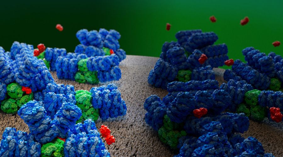 Detailní struktura světlosběrné antény sinic. OCP protein je znázorněn červenou barvou, ostatní barvy označují různé proteiny, které celou anténu tvoří.