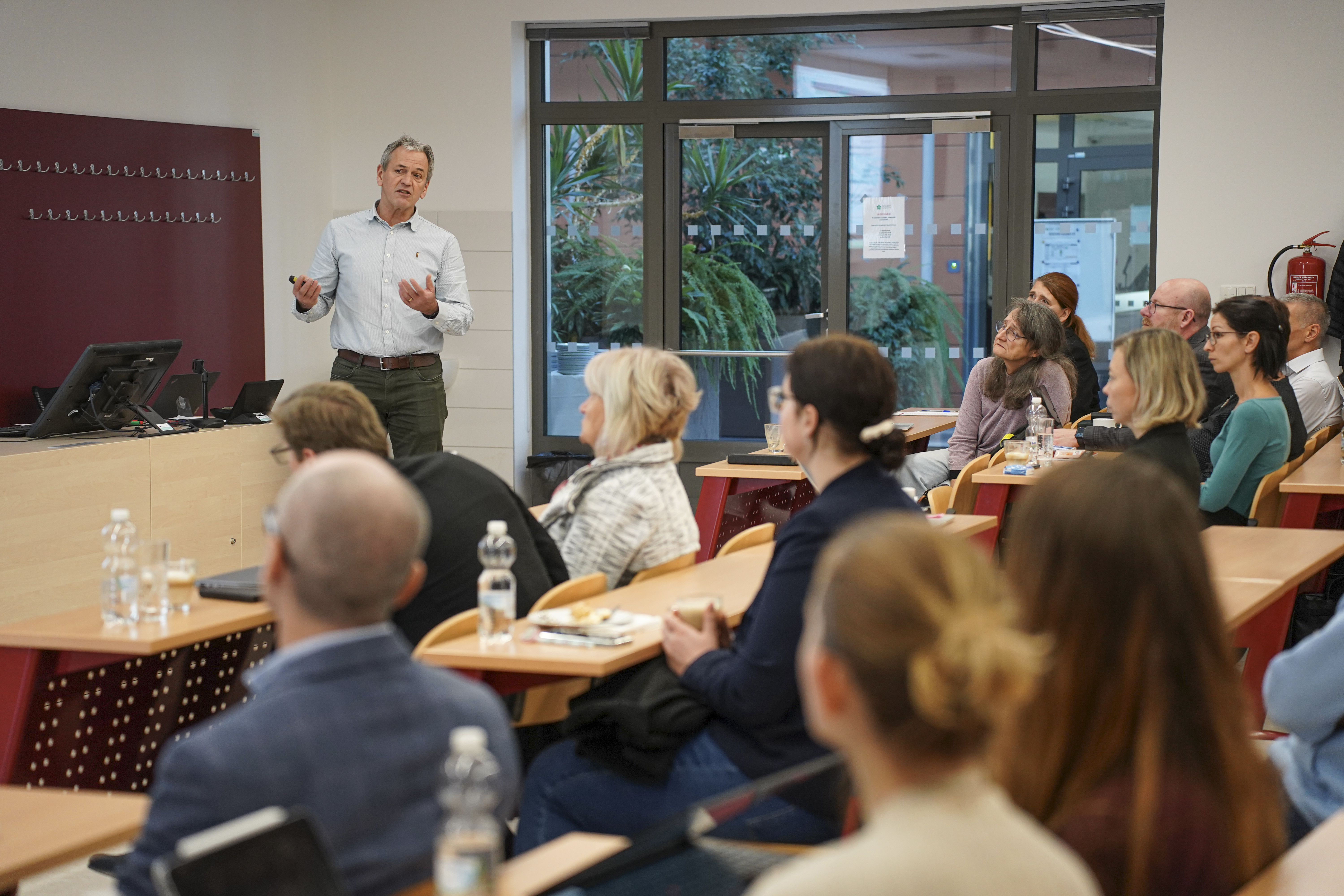 V dopoledním bloku zástupci fakult prezentovali fakultní strategie v oblasti rozvoje, posílení a financování doktorských studijních programů, následně svůj pohled na to, jak JU postupuje jak v řízení doktorských studií, tak v utváření své doktorské školy, představil za skupinu kolegů z Wageningen University prof. Claudius van de Vijver, ředitel The Graduate School for Production Ecology & Resource Conservation (PE&RC). Kolegové z Wageningenu spolupracují s JU už třetím rokem, ve škole doktorských studií vedli letos tři workshopy pro školitele a doktorandy a pomáhají také moderovat diskuse nad koncepčními otázkami univerzitní strategie v oblasti doktorského studia. Součástí shrnutí dopoledního bloku bylo i formulování očekávání, které fakulty kladou na Školu doktorských studií.