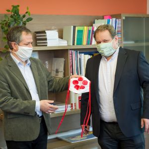 Pro svého následovníka měl k této příležitosti docent Tomáš Machula, který řídil jako rektor Jihočeskou univerzitu předchozí 4 roky, připraveno malé symbolické a snad i trochu aprílové překvapení. V kanceláři rektora mu vyjma přání všeho dobrého předal i roušku se symbolem JU, kterou speciálně připravil pro tuto příležitost.