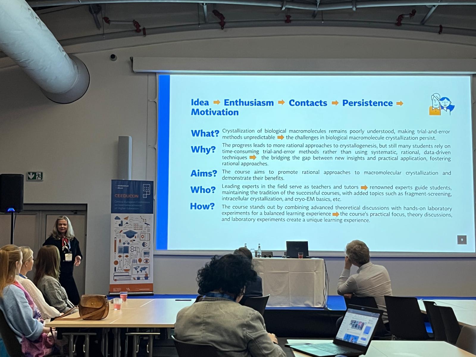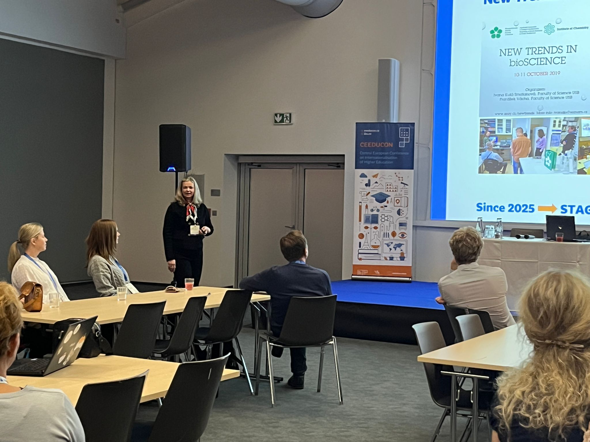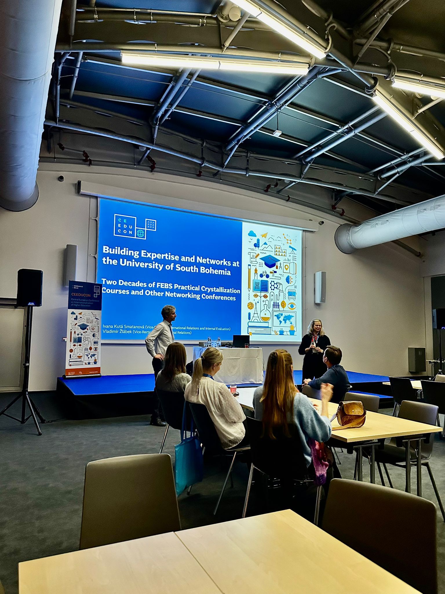 Konference CEEDUCON (Central European Education Conference) je už sedmým rokem klíčovou platformou pro diskusi o internacionalizaci vysokého školství. Do O2 Universum se na ni v tomto ročníku sjelo 900 účastníků. Jihočeskou univerzitu zastupovali proděkani a pracovníci útvarů pro zahraniční vztahy ze všech osmi fakult a rektorátu JU. Jednou z hlavních tematických oblastí byla "Inteligentní a udržitelná mezinárodní spolupráce", do níž přispěli sdílenou přednáškou i zástupci JU Prof. Ivana Kutá Smatanová (proděkanka pro vnitřní hodnocení a zahraniční vztahy PřF JU) a prof. Vladimír Žlábek (prorektor pro zahraniční vztahy JU). Prezentovali příklady dobré praxe v budování mezinárodní spolupráce na JU a představili úspěšné příklady internacionalizace naší univerzity. V plenární přednášce se profesorka Kutá Smatanová zaměřila na spolupráci s evropskými vědeckými společnostmi. Popsala FEBS praktické kurzy zaměřené na krystalizaci makromolekul, které představila jako špičkové vzdělávací akce pro studenty a mladé vědce z celého světa propojující teoretické přednášky s intenzivními praktickými cvičeními a podporující vědeckou excelenci i mezinárodní networking. V závěru přednášky představila příklady, jak se tradiční aktivity tohoto typu přirozeně doplňují s novými formáty, například se sympoziem New Trends in Bioscience, pořádaným pod hlavičkou aliance evropských univerzit KreativEU, jejíž součástí je i Jihočeská univerzita. Tím zároveň navázala na úvodní část přednášky, v níž profesor Žlábek představil Jihočeskou univerzitu a samotnou alianci KreativEU.