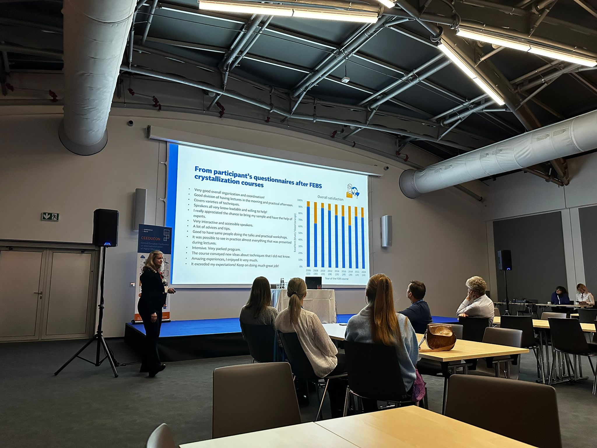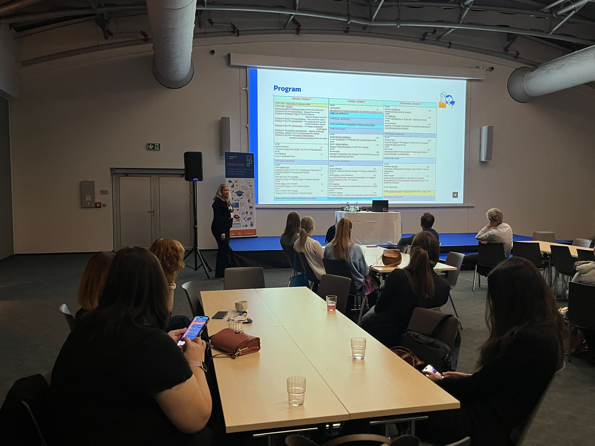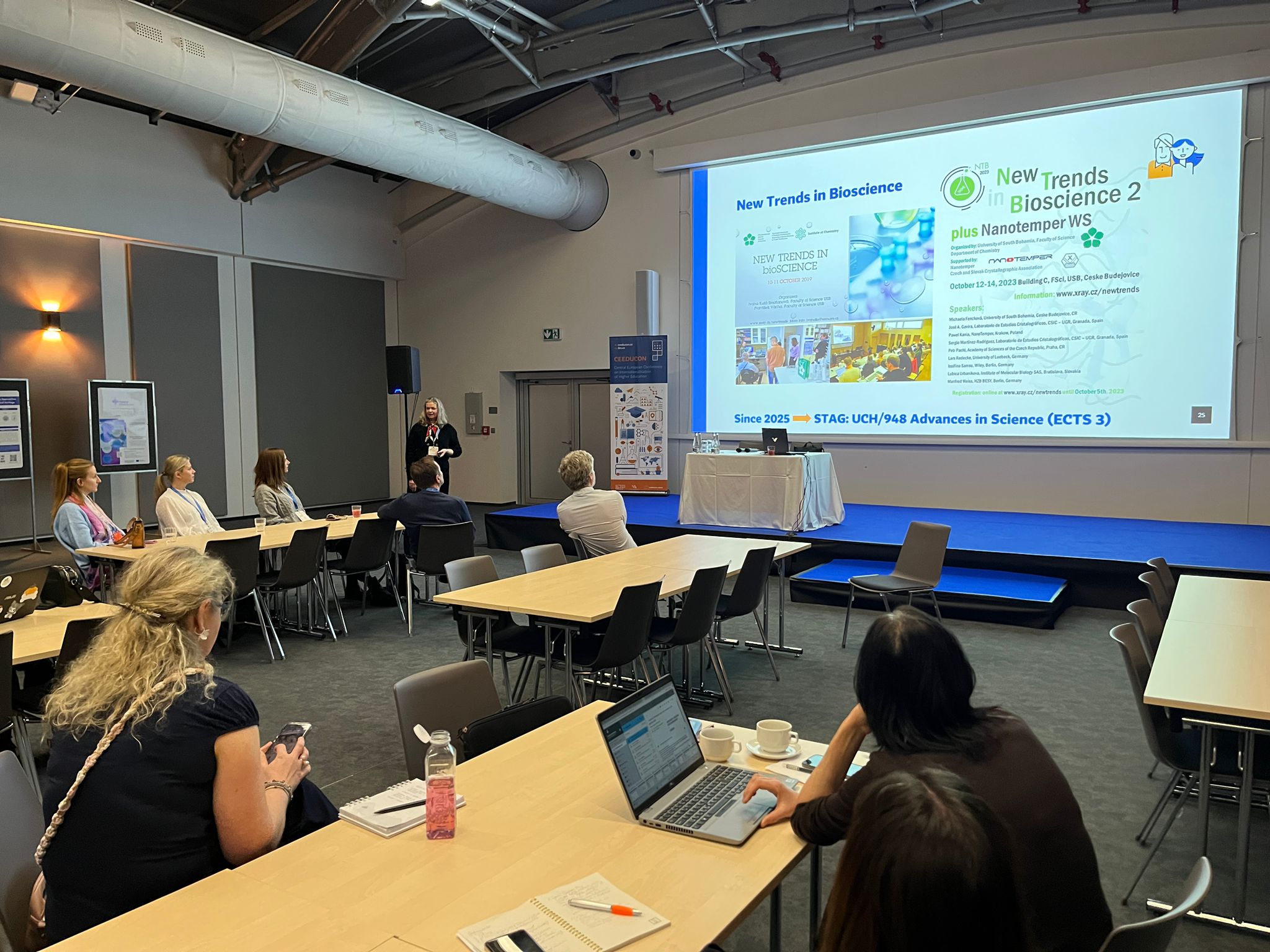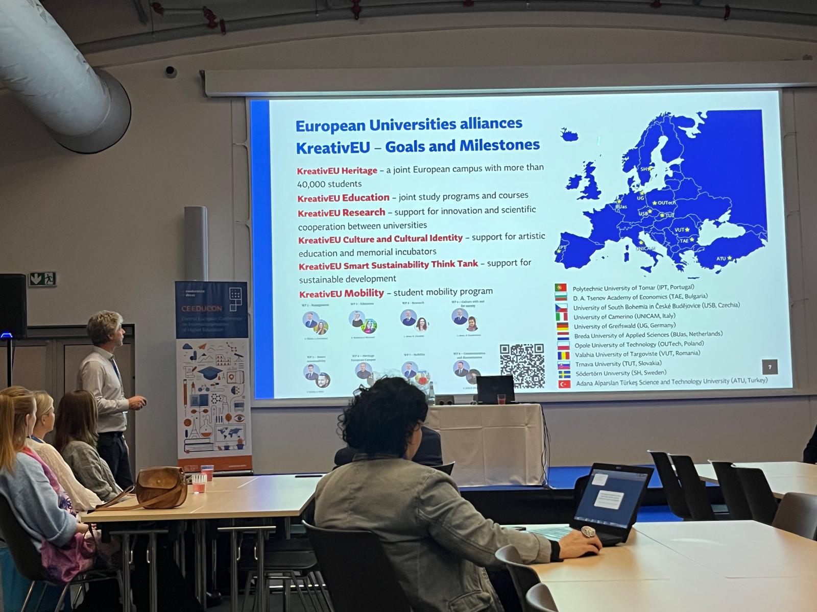 Konference CEEDUCON (Central European Education Conference) je už sedmým rokem klíčovou platformou pro diskusi o internacionalizaci vysokého školství. Do O2 Universum se na ni v tomto ročníku sjelo 900 účastníků. Jihočeskou univerzitu zastupovali proděkani a pracovníci útvarů pro zahraniční vztahy ze všech osmi fakult a rektorátu JU. Jednou z hlavních tematických oblastí byla "Inteligentní a udržitelná mezinárodní spolupráce", do níž přispěli sdílenou přednáškou i zástupci JU Prof. Ivana Kutá Smatanová (proděkanka pro vnitřní hodnocení a zahraniční vztahy PřF JU) a prof. Vladimír Žlábek (prorektor pro zahraniční vztahy JU). Prezentovali příklady dobré praxe v budování mezinárodní spolupráce na JU a představili úspěšné příklady internacionalizace naší univerzity. V plenární přednášce se profesorka Kutá Smatanová zaměřila na spolupráci s evropskými vědeckými společnostmi. Popsala FEBS praktické kurzy zaměřené na krystalizaci makromolekul, které představila jako špičkové vzdělávací akce pro studenty a mladé vědce z celého světa propojující teoretické přednášky s intenzivními praktickými cvičeními a podporující vědeckou excelenci i mezinárodní networking. V závěru přednášky představila příklady, jak se tradiční aktivity tohoto typu přirozeně doplňují s novými formáty, například se sympoziem New Trends in Bioscience, pořádaným pod hlavičkou aliance evropských univerzit KreativEU, jejíž součástí je i Jihočeská univerzita. Tím zároveň navázala na úvodní část přednášky, v níž profesor Žlábek představil Jihočeskou univerzitu a samotnou alianci KreativEU.