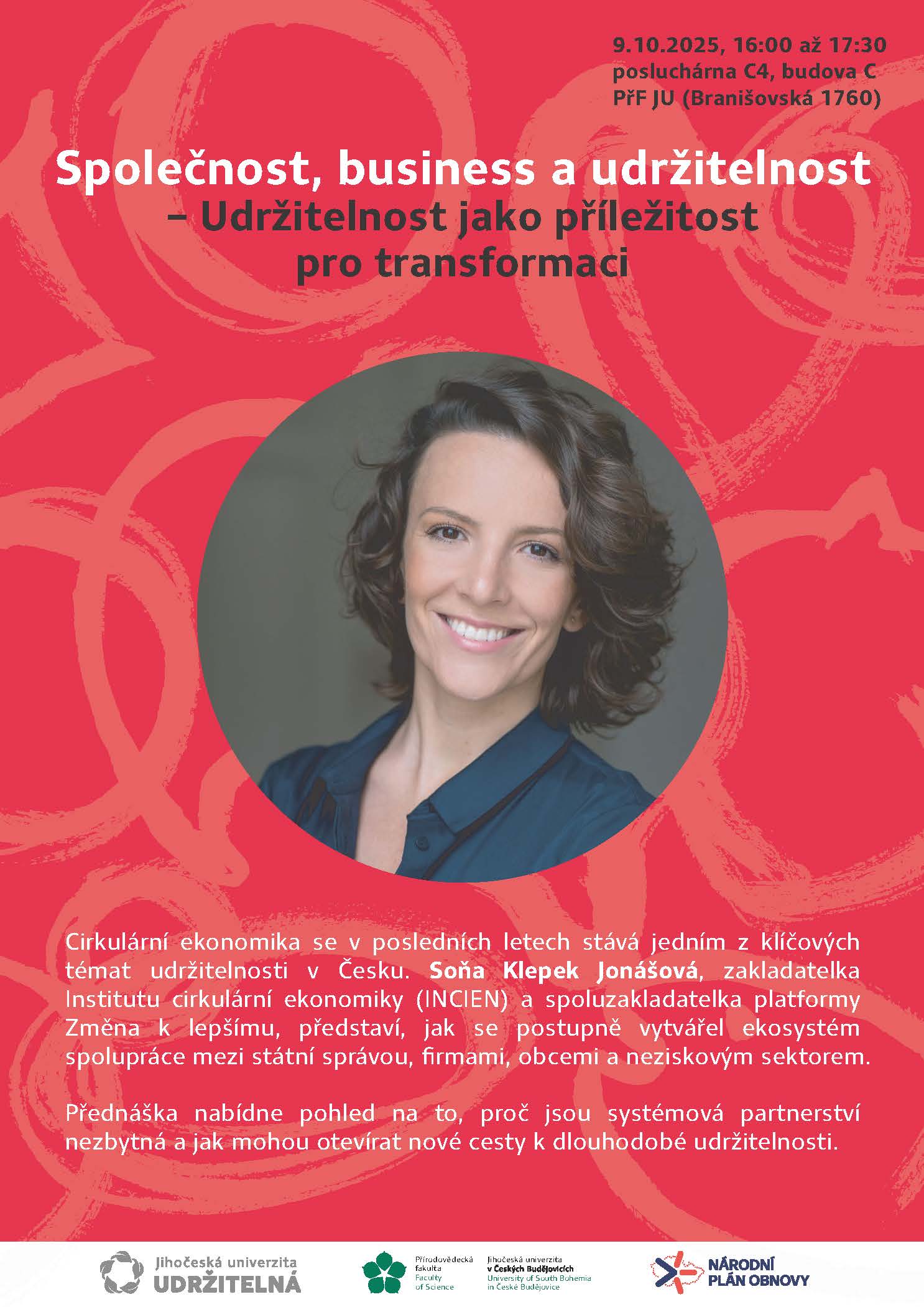 První z přednášek, "Společnost, business a udržitelnost", se koná 9. 10. 2025 od 16:00 až 17:30 v posluchárně C4, budova C PřF JU.