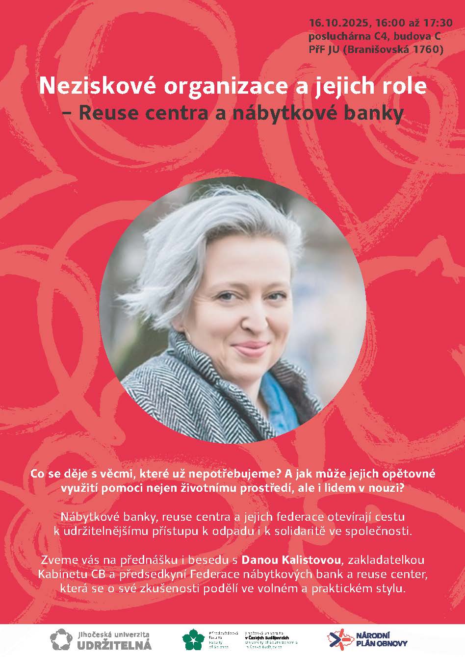 Přednáška se bude konat 16. 10. 2025 od 16:00 až 17:30 v posluchárně C4, budova C PřF JU a téma přiblíží Dana Kalistová, zakladatelka Kabinetu CB a předsedkyně Federace nábytkových bank a reuse center.
