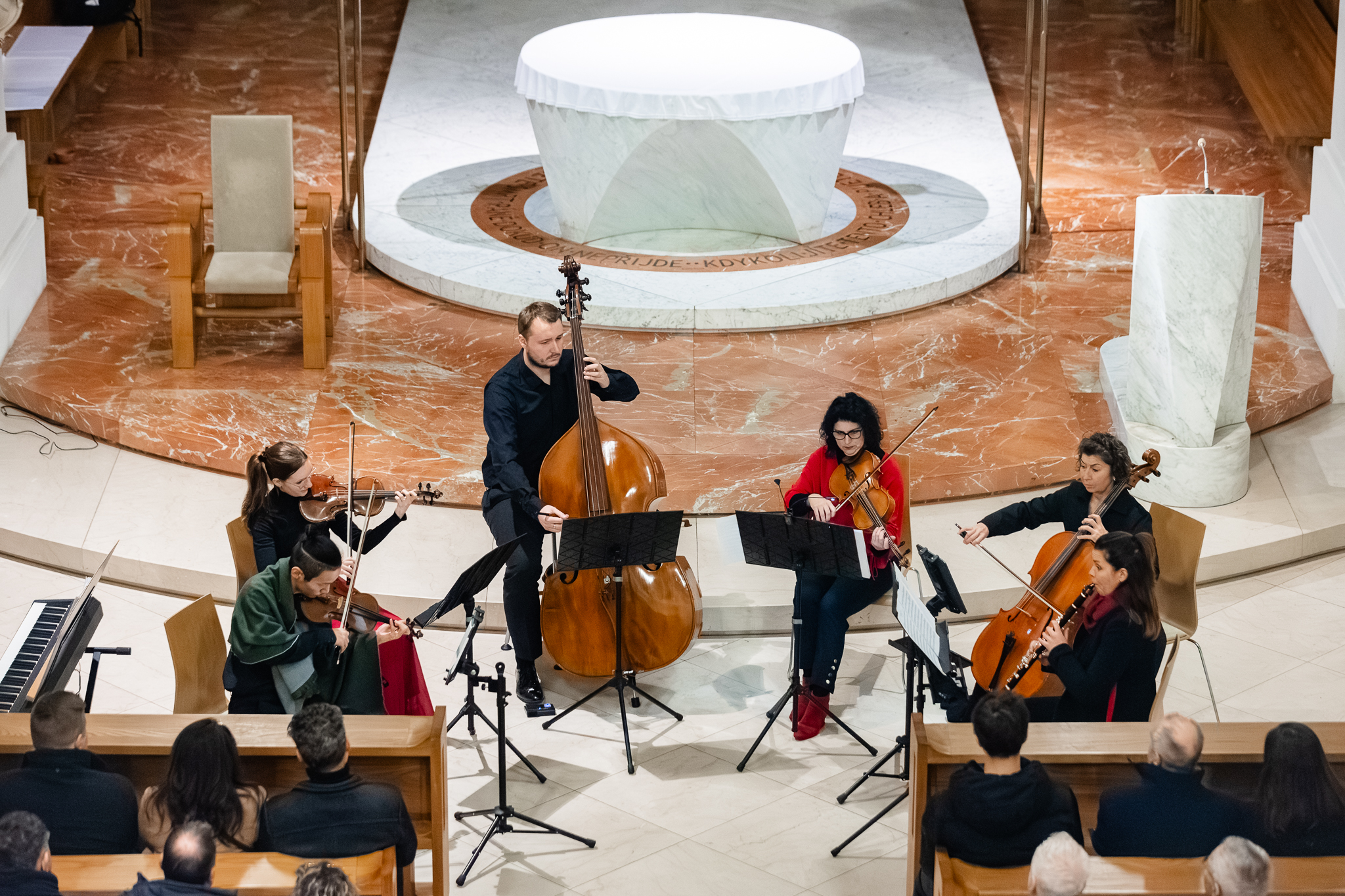 The Bendissimo ensemble is closely connected with the University of South Bohemia through the person of Tomáš Jajtner, a composer and academic who teaches British and American cultural studies, older English literature and the history of translation at the Faculty of Arts of the University of South Bohemia. During his scholarship in the UK he studied historical composition techniques. He has written dozens of compositions in various genres and lectures on music history for the public. Bendissimo performed two of his original compositions: the three-movement Concerto for Clarinet and String Orchestra and the Christmas meditation Roses of the Jesse Tribe. The clarinet was played by the founder and artistic director of the ensemble, Eliška Bendová, 1st violin by Ryohei Hirono, 2nd violin by Eva Nepivodová, viola by Jaroslava Procházková, cello by Jana Matějková, and double bass by Michal Hromádko.