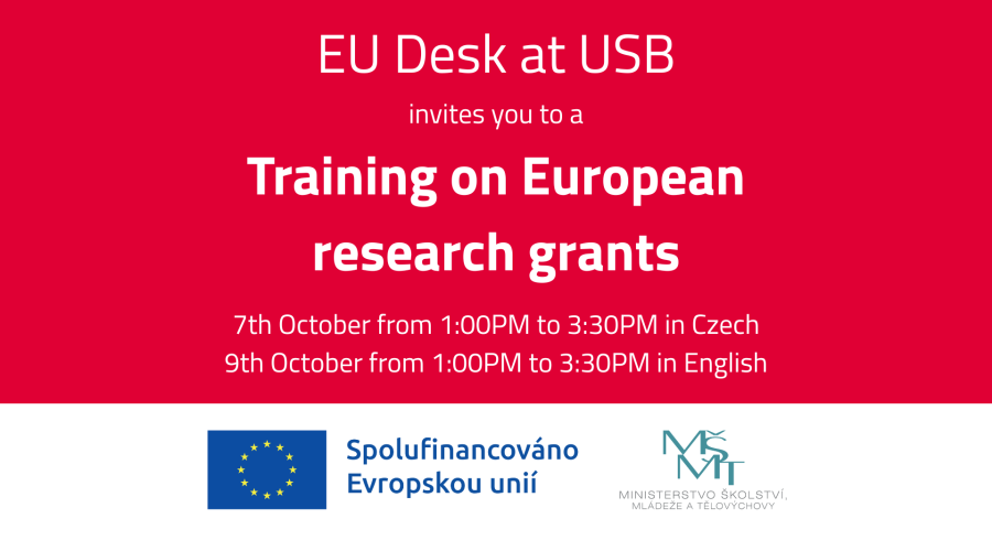 Newly established EU Desk at the University of South Bohemia will organise its very first training on European research grants. This year, the training focuses on grants under the Horizon Europe programme, with a special focus on Marie Sklodowska-Curies Actions (MSCA) and European Research Council (ERC).